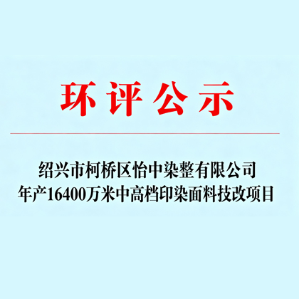查看更多绍兴市柯桥区怡中染整有限公司 年产16400万米中高档印染布生产线技改项目环评公示 (一)建设项目基本情况 绍兴市柯桥区怡中染整有限公司成立于2003年11月6日,位于绍兴市柯桥区马鞍街道兴滨路与北五路交叉口,占地面积120亩,建筑面积84000平方米,配置印染及后整理生产设备,主要从事人棉、混纺织物等高档针织面料的印染和后整理加工。企业现有职工800人,三班制生产,全年工作日300天。 经查阅资...